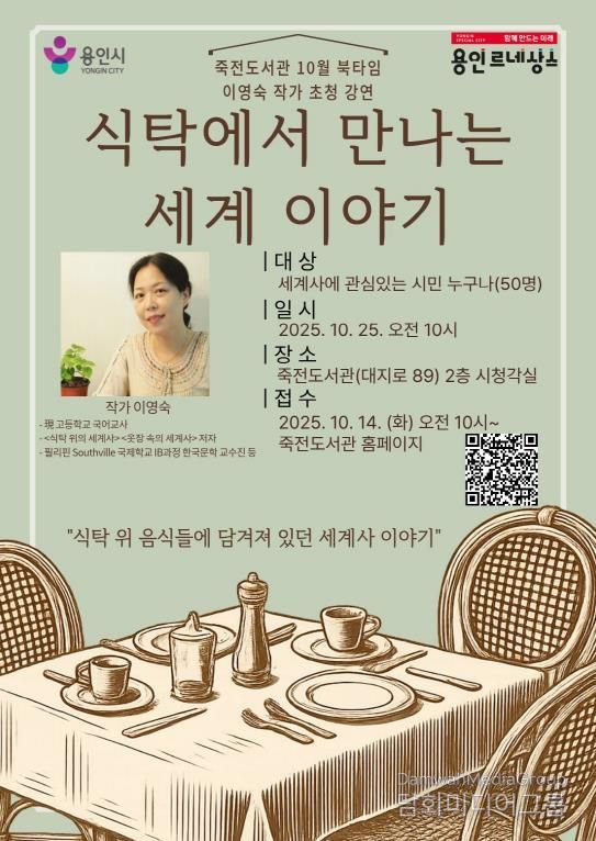 시민행정신문 강갑수 기자 | 용인특례시는 25일 오전 10시 죽전도서관 시청각실에서 죽전도서관 북타임 작가초청강연회 ‘식탁에서 만나는 세계 이야기’를 연다고 13일 밝혔다.
