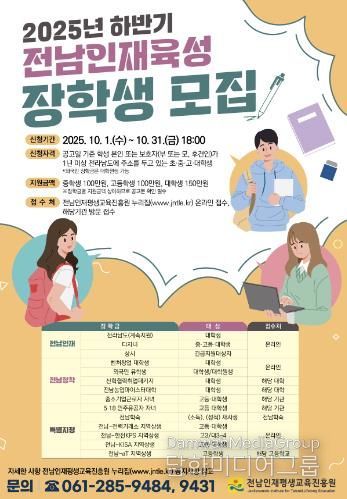 시민행정신문 강갑수 기자 | 전라남도와 전남인재평생교육진흥원은 실질적인 교육기회 보장과 미래인재로의 성장, 지역 정착을 지원하기 위한 2025년 하반기 전남인재육성 장학생을 오는 31일까지 모집한다.