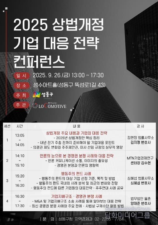 시민행정신문 강갑수 기자 | 서울 성동구는 지난달 26일 성수타운매니지먼트(Seongsu Town Management) 사업의 일환으로 진행된 '2025 상법개정과 기업의 대응전략' 컨퍼런스를 성공적으로 마쳤다고 밝혔다.