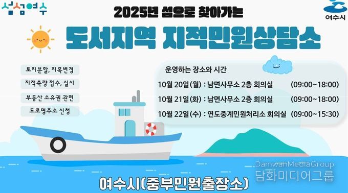 시민행정신문 강갑수 기자 | 여수시는 오는 10월 20일부터 22일까지 도서지역 주민들의 지적·부동산·도로명주소 관련 민원을 현장에서 직접 상담·처리하는 ‘찾아가는 지적민원상담소’를 운영한다고 밝혔다.