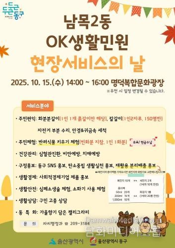 시민행정신문 강갑수 기자 | 울산 동구는 오는 10월 15일 오후 2시부터 4시까지 명덕복합문화광장에서 ‘남목2동 OK생활민원 현장서비스의 날’ 행사를 개최한다.