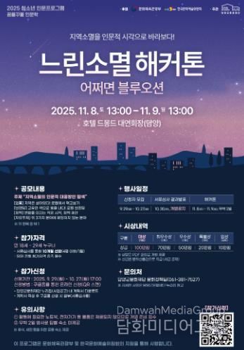 시민행정신문 강갑수 기자 | 담양군문화재단은 오는 11월 8일부터 9일까지 지역소멸 대응 인문사회적 문제해결방안을 탐색하는 「느린소멸 해커톤」을 개최한다고 밝혔다.