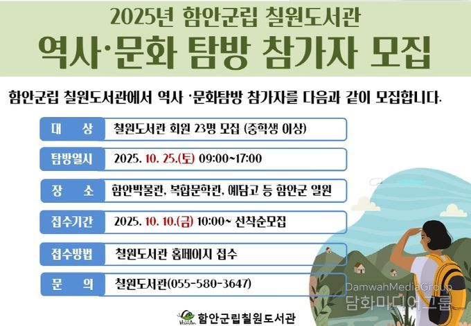 시민행정신문 기자 | 함안군립 칠원도서관이 '2025년 하반기 역사·문화탐방' 프로그램 참가자를 모집한다.