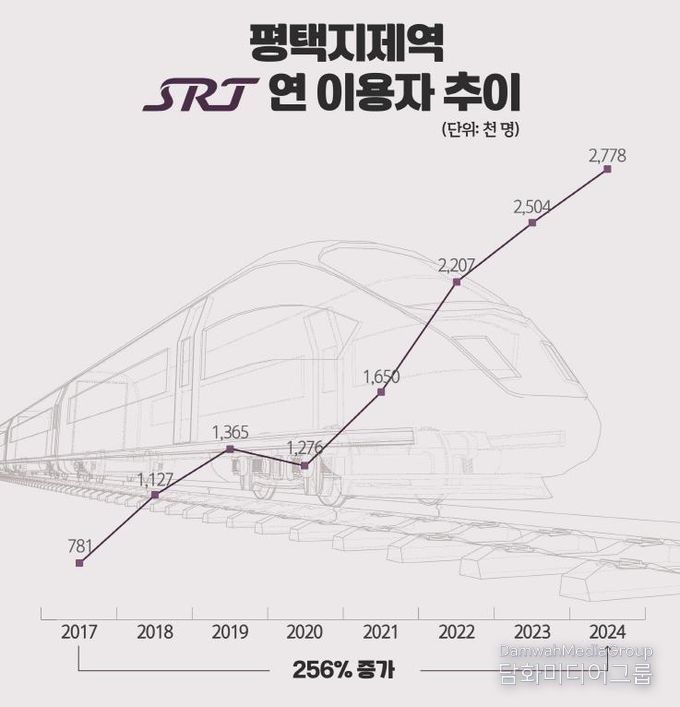 평택지제역은 2016년 개통 당시부터 SRT가 정차한 역사로, 매년 이용객 수가 꾸준히 증가하고 있다. 실제 ‘철도연감’에 따르면 평택지제역의 연간 SRT 승하차 인원은 2017년 78만 1천 명이었지만, 2024년에는 277만 8천 명으로 256%의 증가율을 기록했다. 이러한 증가율은 SRT 역사 중 가장 높은 수치다.