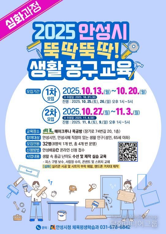 시민행정신문 강갑수 기자 | 안성시는 시민들의 생활 자립 역량 강화를 위해 '뚝딱뚝딱 생활 공구[심화과정] 교육'을 오는 10월 25~26일과 11월 8~9일, 총 2회 주말 일정으로 운영한다고 밝혔다.