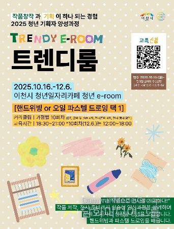 ▲오일파스텔 드로잉 ▲핸드위빙으로 구성하여 예술 작품 제작 및 전시를 준비 및 운영함으로써 문화 기획과 창작 역량을 동시에 강화하는 본 과정은 19세 이상 39세 이하 관내 청년이면 누구나 10월 13일부터 큐알(QR)코드를 통해 신청할 수 있다.