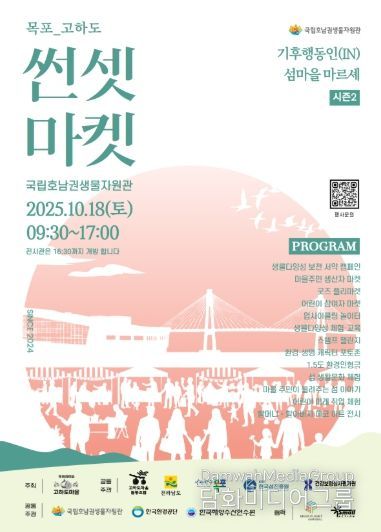 정희록 국립호남권생물자원관 상생협력부장은 “2024년에 이어 올해 두 번째로 열리는 고하도 썬셋 마켓이 섬마을의 복합 문화 행사로 자리매김하기를 기대한다.”라며 “가족이 함께 고하도를 찾아가 가을을 여유롭게 즐기는 소풍이 되길 바란다”라고 말했다.