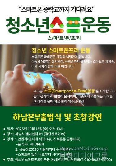 시민행정신문 강갑수 기자 | 15일 오전 10시, 하남시 벤처센터에서 ‘청소년 스마트폰 프리 운동(Smartphone-Free)’ 하남본부 출범식을 갖는다.