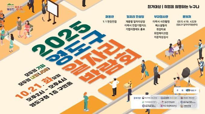 시민행정신문 강갑수 기자 | 부산 영도구는 구직자와 기업 간 만남의 장을 마련하고 다양한 취업 기회를 제공하기 위해 오는 10월 21일 오후 2시부터 4시까지 영도구청 1층 구민홀에서 ‘2025년 영도구 일자리박람회’를 개최한다고 밝혔다.