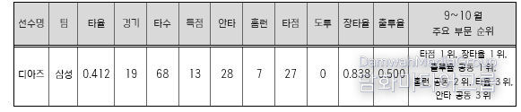9~10월 MVP로 선정된 디아즈에게는 상금 300만원과 트로피가 전달될 예정이다.