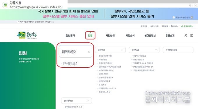 이번에 임시 개통한 '강릉시 새올전자민원창구'는 지난 국가정보자원관리원의 화재로 인한 국민신문고 중단에 따른 온라인 민원상담을 대체하고자 운영하며, 국민신문고시스템이 재개되는 시점에 운영을 종료할 예정이다.