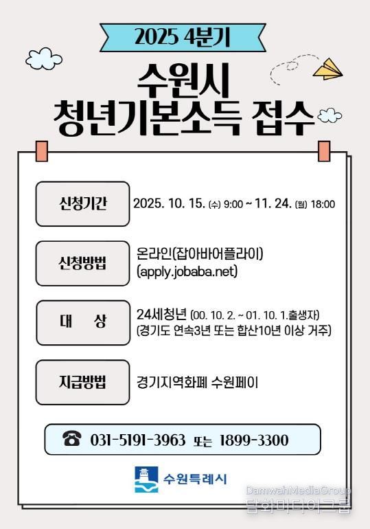 시민행정신문 강갑수 기자 | 수원특례시는 10월 15일 오전 9시부터 11월 24일 오후 6시까지 24세 청년을 대상으로 ‘2025년 4분기 청년기본소득’ 신청을 받는다.