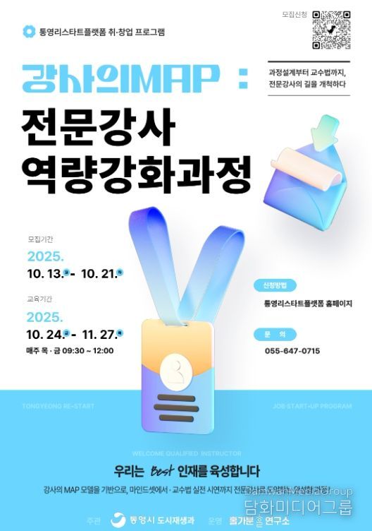 이상용 도시재생과장은 “이번 과정을 통해 다양한 분야의 전문강사들이 한층 더 성장할 수 있는 계기가 되기를 바란다”며 “통영시민과 통영시에서 활동하고 있는 강사들의 많은 관심과 참여를 바란다”고 전했다.