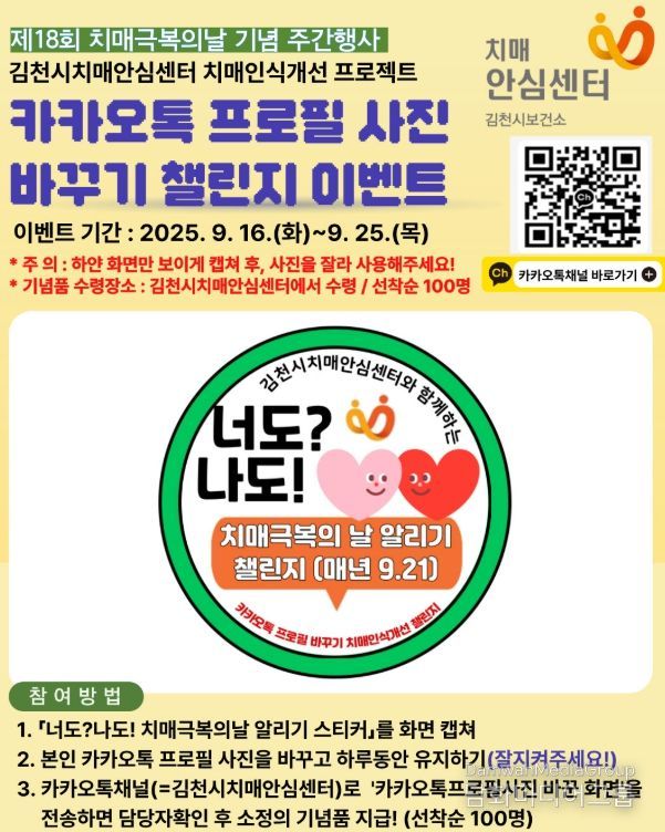 특히 ‘카카오톡 프로필 사진 바꾸기’ 챌린지 캠페인 활동에는 많은 시민이 자발적으로 참여해, 김천 전역으로 치매 인식 개선의 물결이 이어졌다.