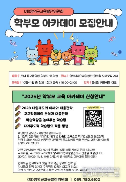 시민행정신문 강갑수 기자 | (재)영덕군교육발전위원회는 급변하는 대학입시 환경에 효과적으로 대응하고, 학부모들의 교육 역량 강화를 위해 ‘학부모 교육 아카데미’를 운영한다.