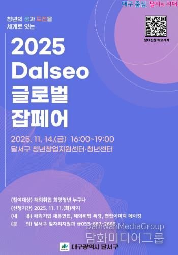 시민행정신문 강갑수 기자 | 대구 달서구는 오는 11월 14일, 달서구 청년창업지원센터·청년센터에서 해외취업을 희망하는 청년들을 대상으로 '2025 Dalseo 글로벌 잡페어'를 개최한다.