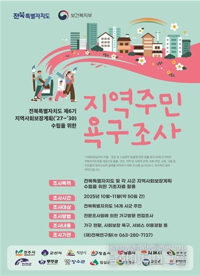 시민행정신문 강갑수 기자 | 전북특별자치도가 지역사회 복지 욕구를 체계적으로 파악하고 주민이 체감하는 복지정책을 수립하기 위해 전 도민을 대상으로 지역주민 욕구조사를 실시한다.