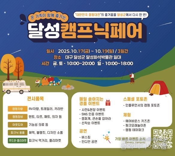 시민행정신문 강갑수 기자 | 달성군은 오는 17일부터 19일까지 달성화석박물관 앞 광장에서 캠핑용품 전시·판매와 캠핑 문화를 체험할 수 있는 ‘달성캠프닉페어’를 개최한다고 밝혔다.