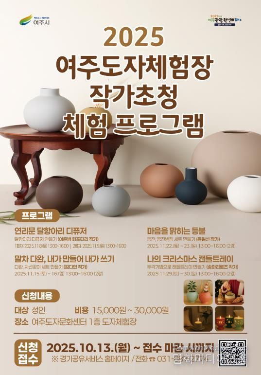 여주시 관계자는 “작가와 함께하는 이번 체험 프로그램은 나만의 도자기를 직접 만드는 특별한 기회가 될 것”이라며 “시민들의 많은 관심과 참여를 바란다”고 말했다.