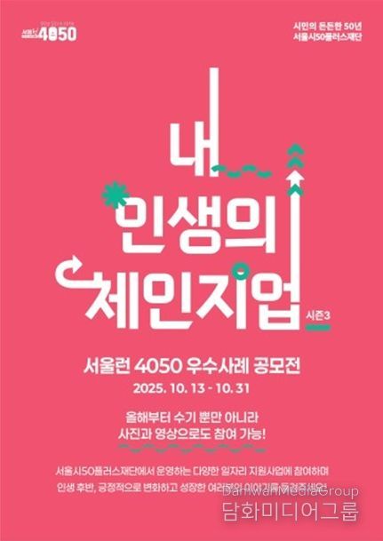 서울시50플러스재단은 10월 13일부터 31일까지 ‘서울런4050’을 통해 성공적인 인생 전환을 경험한 중장년의 이야기를 찾는다고 밝혔다. 기존의 수기 형식 외에 영상, 사진, 웹툰 등 디지털 콘텐츠를 SNS에 게시하는 방식으로도 참여할 수 있다.
