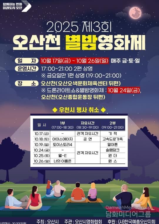 시 관계자는 “도심 속 자연과 문화가 조화를 이루는 오산천에서 열리는 이번 별밤영화제가 시민들에게 힐링과 특별한 문화 체험의 기회가 되길 바란다”고 전했다.