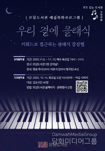 시민행정신문 기자 | 김포시 모담도서관은 클래식을 주제로 11월 6일부터 13일까지 매주 목요일 오후 7시부터 9시까지 특별 강연을 운영한다.