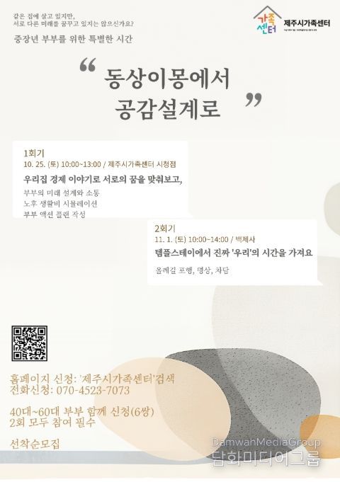시민행정신문 강갑수 기자 | 제주시는 제주시 가족센터와 함께 중장년 부부의 건강하고 행복한 가정생활을 지원하기 위해 ‘동상이몽에서 공감설계로’ 프로그램을 운영한다.
