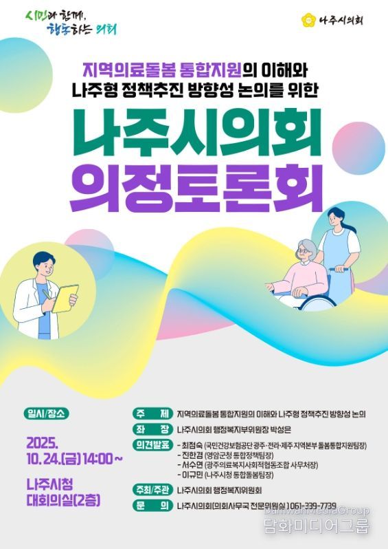 토론회는 박성은 나주시의회 행정복지위원회 부위원장이 좌장을 맡아 진행되며, 최점숙 국민건강보험공단 광주·전라·제주지역본부 돌봄통합지원팀장, 진한겸 전라남도 영암군청 통합정책팀장, 서수연 광주의료복지사회적협동조합 사무처장, 이규민 나주시청 통합돌봄 팀장의 의견발표로 진행될 예정이다.