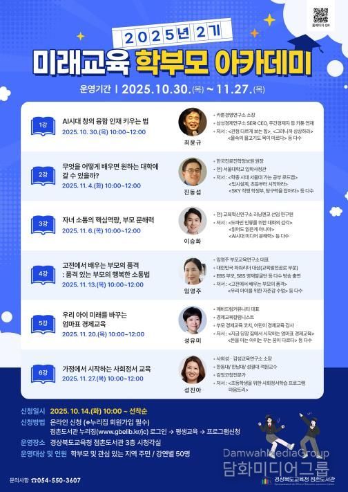 시민행정신문 기자 | 경상북도교육청 점촌도서관은 10월 30일부터 11월 27일까지 학부모 및 일반인을 대상으로 2025년 2기'미래교육 학부모 아카데미'를 운영한다.