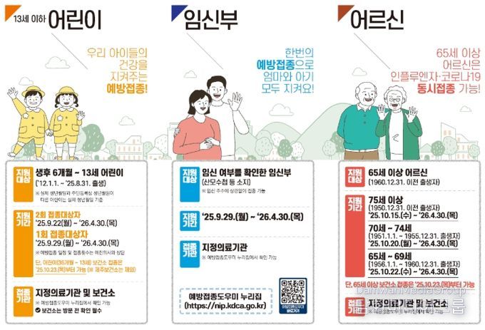 생후 6개월~13세(’12.1.1.~’25.8.31. 출생) 어린이, 임신부, 65세 이상 어르신은 인플루엔자 접종을 무료로 받을 수 있다.