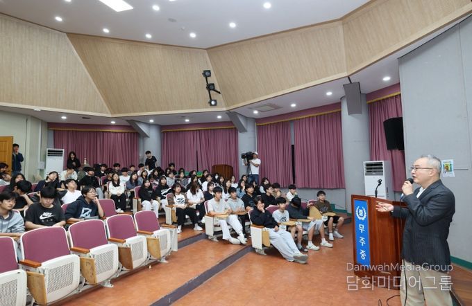 무주중학교 시청각실에서 개최된 이날 행사는 지역 내 학생들의 독서문화를 선도하고 인문학적 소양 증진에 기여하기 위해 마련된 것으로, 2025 무주군 올해의 책으로 선정된 청소년 부문 도서, “인권을 들어 올린 스포츠 선수들”의 저자 최동호 작가가 진행했다.