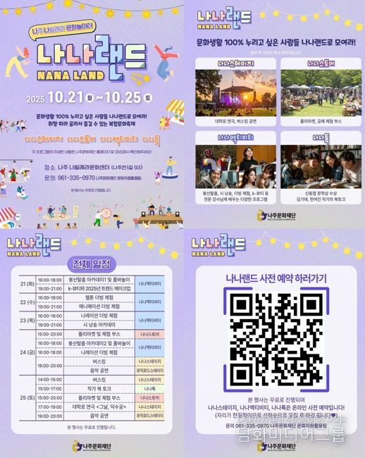 김찬동 나주문화재단 대표이사는 “‘나나랜드’는 시민이 주체가 되어 문화를 함께 만들고 즐기는 축제가 될 것”이라며 “지역의 일상에 문화가 자연스럽게 스며들 수 있도록 시민 중심의 문화예술 프로그램을 지속적으로 추진하겠다”고 말했다.