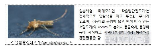 일본뇌염 매개모기인 작은빨간집모기는 암갈색 소형 모기로 주로 야간에 흡혈활동을 하고, 우리나라 전 지역에서 10월까지 활동하는 것으로 관찰된다. 일본뇌염 매개모기 감시 결과 9월말 기준(39주차) 평균 108개체로 지속적으로 발생하고 있으므로, 모기 물림에 주의하고, 증상 발현 시 신속하게 의료기관을 방문하여 진단 및 치료를 받아야 한다.