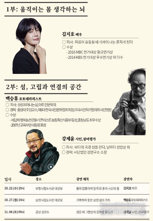 11월에는 강제윤 섬연구소 소장, 오은 시인, 김태훈 팝칼럼니스트, 김탁환 소설가 등이 섬, 독서, 영화를 주제로 강연과 탐방을 이어간다.