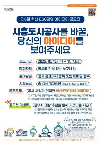 시민행정신문 강갑수 기자 | 시흥도시공사는 10월 15일부터 11월 7일까지 ‘제6회 시흥도시공사 혁신·ESG경영 아이디어 공모전’을 개최한다.