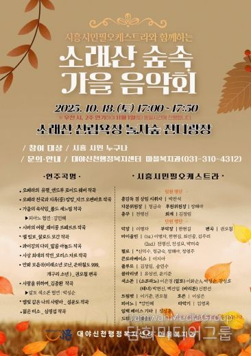 시민행정신문 기자 | 시흥시 대야ㆍ신천행정복지센터는 오는 10월 18일 소래산 삼림욕장 놀자숲 잔디광장에서 대야ㆍ신천동 지역 주민을 위한 ‘소래산 숲속 가을 음악회’를 개최한다.