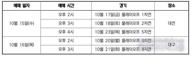 플레이오프 입장권은 포스트시즌 입장권 단독 판매사인 NOL 티켓 예매 홈페이지와 애플리케이션 그리고 NOL 티켓 고객센터(전화 1544-1555)를 통해 1인당 최대 4매까지 가능하다.