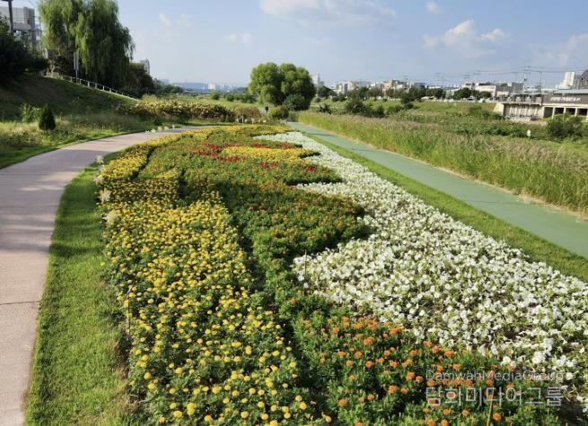 용평교~방서교 일원 꽃정원은 황화코스모스가 활짝 폈고, 롤러스케이트장 튤립정원에는 황화코스모스와 숙근버베나가 조화를 이루고 있다.