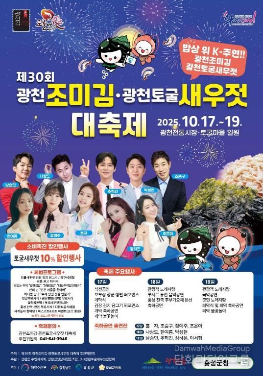 시민행정신문 기자 | 홍성군 광천읍은 오는 17일부터 19일까지 3일간 광천전통시장 및 토굴마을 일원에서 ‘제30회 광천조미김·광천토굴새우젓 대축제’의 성대한 막을 올릴 예정이라고 밝혔다.