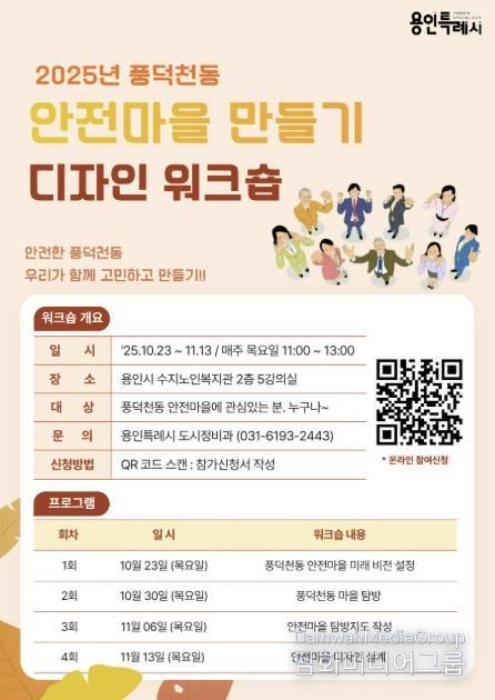 시민행정신문 강갑수 기자 | 용인특례시는 수지구 풍덕천동 ‘안전마을 만들기 디자인 워크숍’ 참가자를 모집 중이라고 15일 밝혔다.