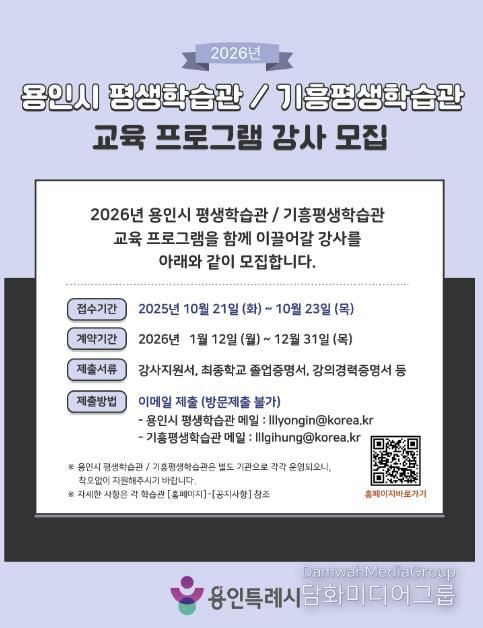 시민행정신문 강갑수 기자 | 용인특례시는 21일부터 23일까지 3일간 ‘2026년 평생학습관 프로그램’을 운영할 강사를 모집한다고 15일 밝혔다.