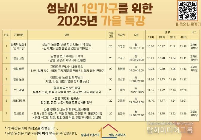 시민행정신문 강갑수 기자 | 성남시는 오는 10월 20일부터 12월 29일까지 중원구 하대원동 1인 가구 힐링스페이스에서 총 150명이 참여하는 7개 과목(과목별 20~30명)의 특강을 연다.