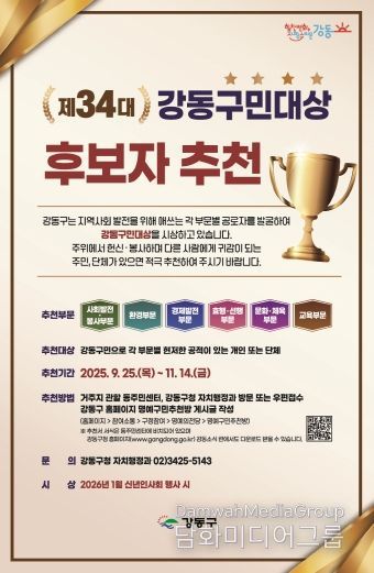 한편, 제34대 강동구민대상 시상식은 2026년 1월 열리는 신년인사회에서 진행될 예정으로, 최종 수상자에게는 구 각종 공식 행사에 우선 초청되는 특전과 함께 구정 참여 기회가 제공되며, 보다 자세한 사항은 강동구청 누리집(홈페이지) 또는 자치행정과를 통해 안내받을 수 있다.
