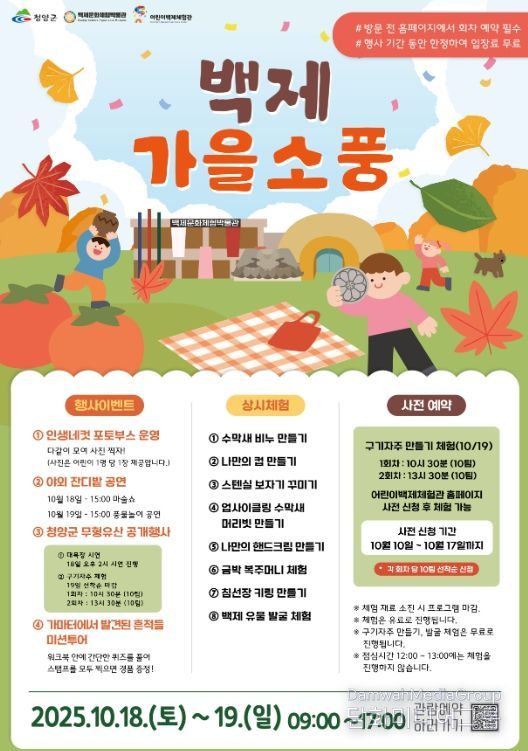 시민행정신문 강갑수 기자 | 청양군은 오는 18일부터 19일까지 이틀간 백제문화체험박물관과 어린이백제체험관에서 ‘제5회 백제전통문화행사 백제 가을 소풍’을 개최한다.