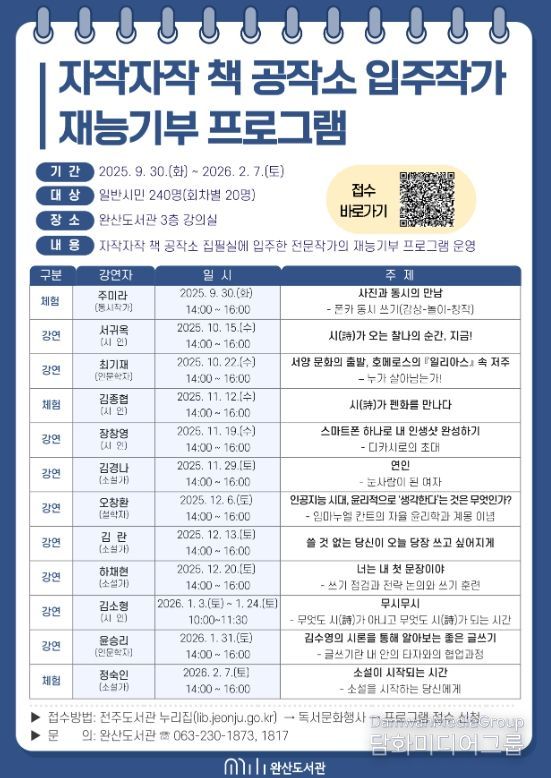 박남미 전주시 도서관평생학습본부장은 “이번 프로그램은 전문작가들이 시민과 직접 만나 지식과 경험을 나누는 뜻깊은 자리”라며 “많은 시민이 참여해 글 쓰는 창작의 기쁨을 함께 나누길 바란다”고 말했다.