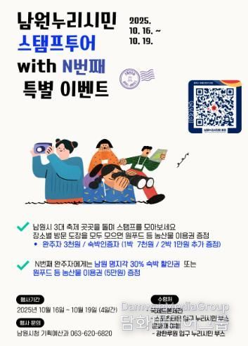 시민행정신문 강갑수 기자 | 남원시가 남원누리시민 인지도 제고와 지역상권 활성화를 위해 오는 10월 16일부터 19일까지 개최하는 국제드론제전, 흥부제, 국가유산야행 등 가을 3대 축제와 연계하여 관외 누리시민 대상으로 스탬프 투어 등 다양한 경품 이벤트를 마련했다.