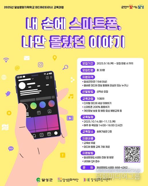 시민행정신문 기자 | (재)달성문화재단 달성문화도시센터는 10월 14일부터 11월 13일까지 선비체험관(송해기념관) 2층에서 ‘미디어리터러시 교육과정 – 내 손에 스마트폰, 나만 몰랐던 이야기’를 진행한다.