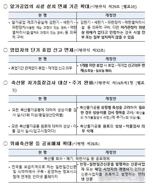 주요 내용은 ①알가공업 시설기준 완화, ②영업자의 단기 휴업신고 면제, ③축산물가공품 자가품질검사 대상·주기 완화, ④위해 축산물 등 공표 매체 확대 등이다.