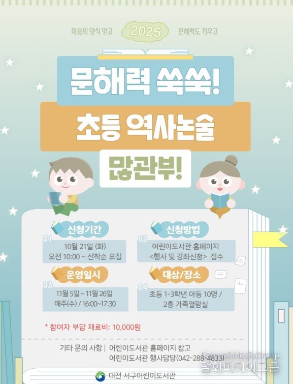 시민행정신문 강갑수 기자 | 대전 서구 어린이도서관은 관내 초등학교 아동을 대상으로‘문해력 쑥쑥! 초등 역사논술’을 운영한다고 16일 전했다.