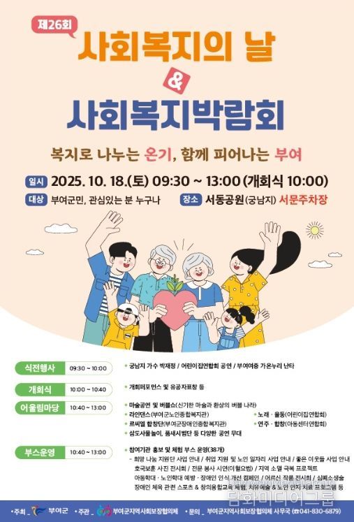 시민행정신문 강갑수 기자 | 부여군은 오는 10월 18일 서동공원 서문주차장에서 ‘제26회 사회복지의 날 및 사회복지박람회’를 개최한다고 밝혔다.